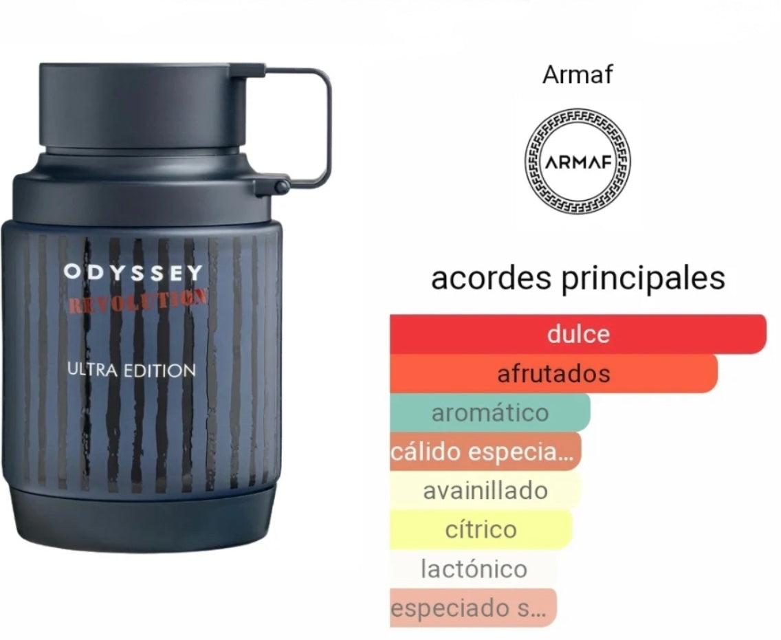Odyssey Revolution Ultra Edition de Armaf es una fragancia masculina intensa, moderna y seductora. Su combinación de notas dulces, afrutadas y especiadas crea un aroma irresistible con un fondo cálido y ambarado. Diseñado para el hombre que busca destacar con un toque audaz y sofisticado, ideal para noches especiales o eventos donde quiere dejar huella.