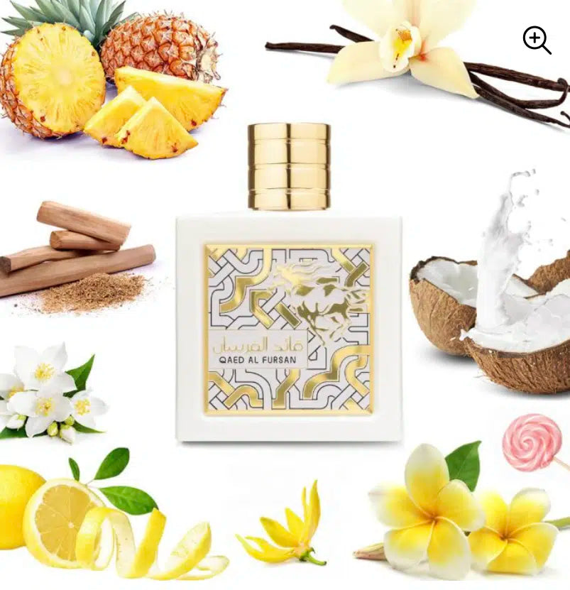 Qaed Al Fursan Unlimited de Lattafa es una fragancia exótica, dulce y tropical que combina elegancia árabe con un toque moderno y veraniego. Su salida jugosa de piña fresca y limón se mezcla con la suavidad del coco y la vainilla, creando una experiencia olfativa cremosa, brillante y adictiva.